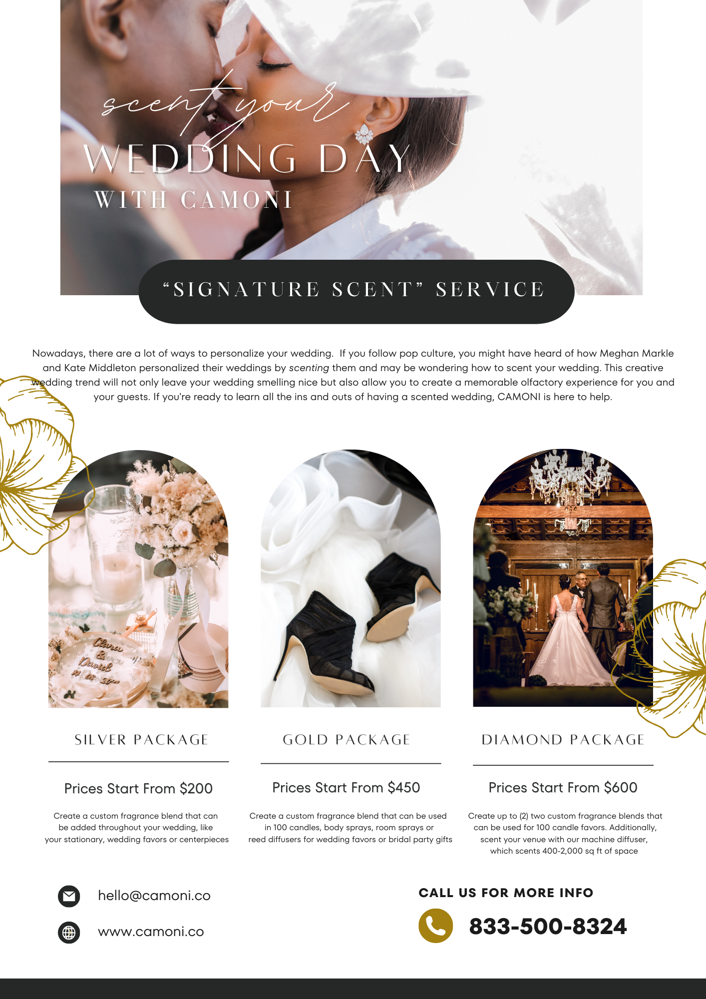 Silver Package: Create a custom fragrance blend that can be added throughout your wedding, like your stationary, wedding favors or centerpieces. Couple will be provided a 4 oz bottle of the custom fragrance.